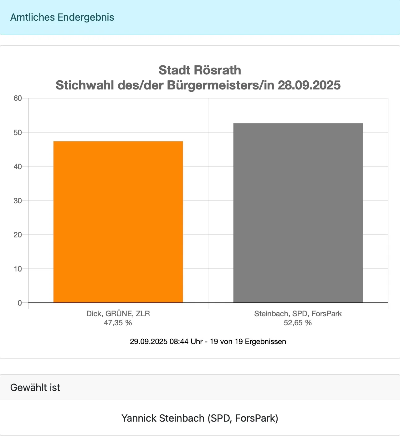 Bei der Stichwahl setzte sich unser Vorstands- und Fraktionsvorsitzender Yannick Steinbach mit 52,65% der Stimmen gegen Giselher Dick durch und ist damit