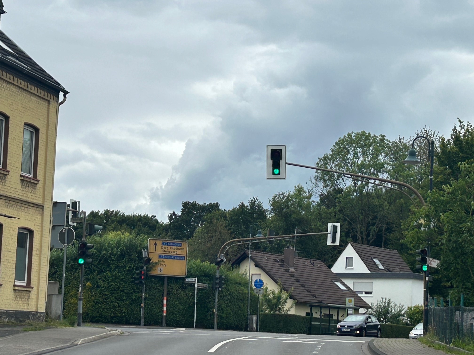 Die Ampel an der Bensberger Straße in Fahrtrichtung Bensberg (wie auf dem Bild zusehen) zeigt seit einigen Wochen verkehrsunabhängig lange grün. Die